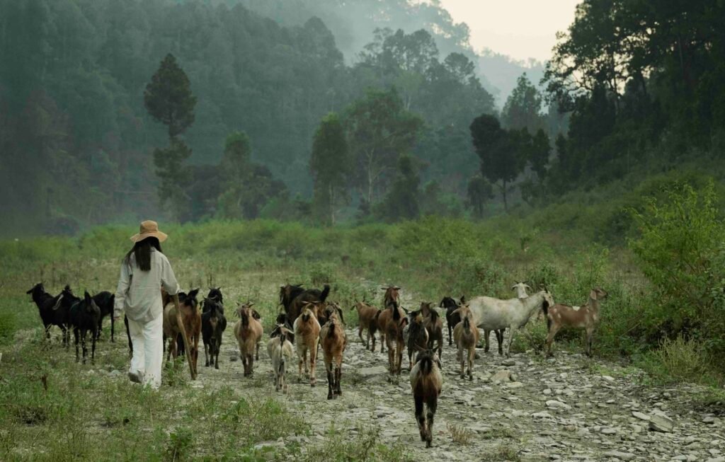 On the return, cross paths with shepherds herding their goats home after a day in the hills, while the sun dips behind distant hills and smoke rises from village chimneys, marking the close of the day.