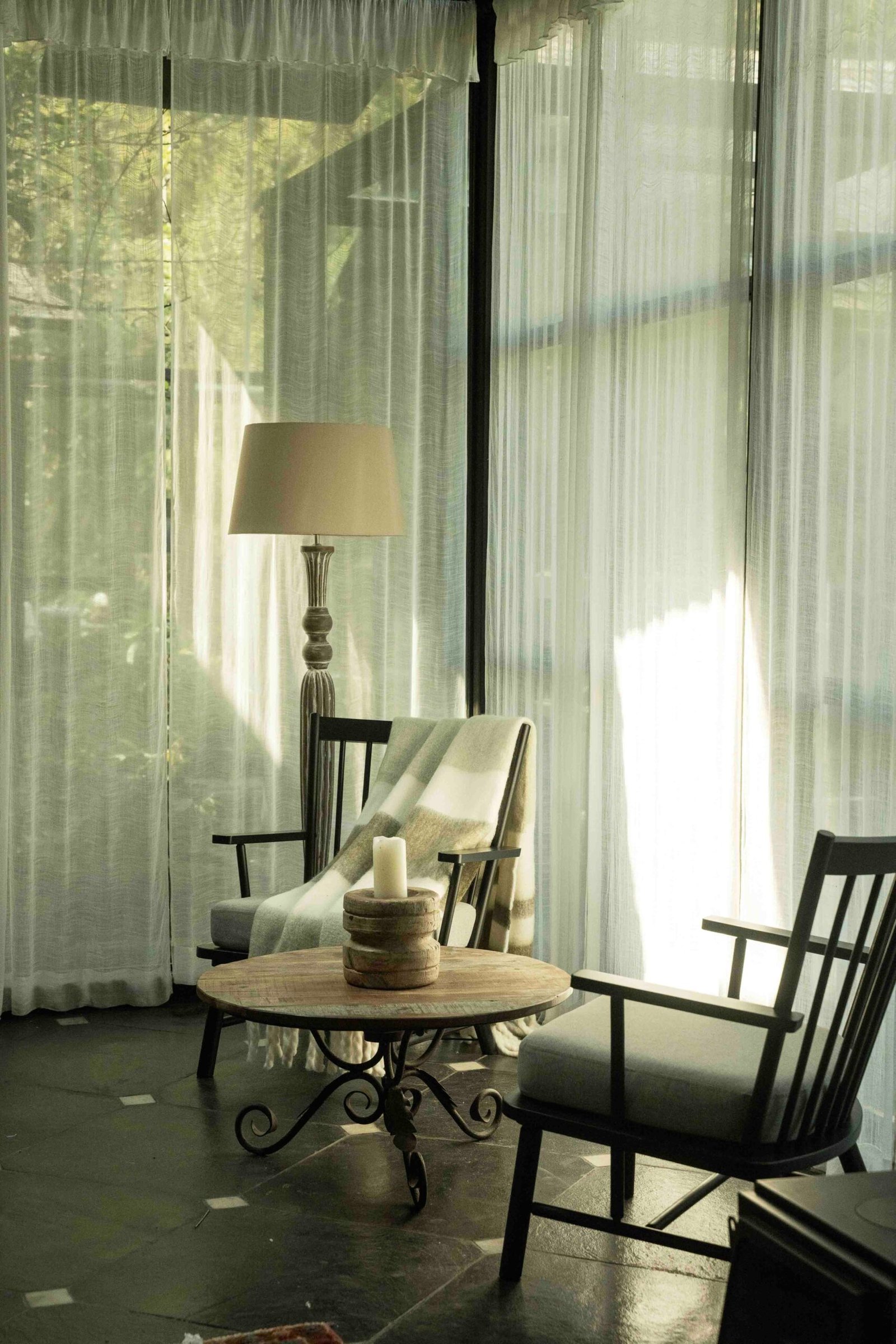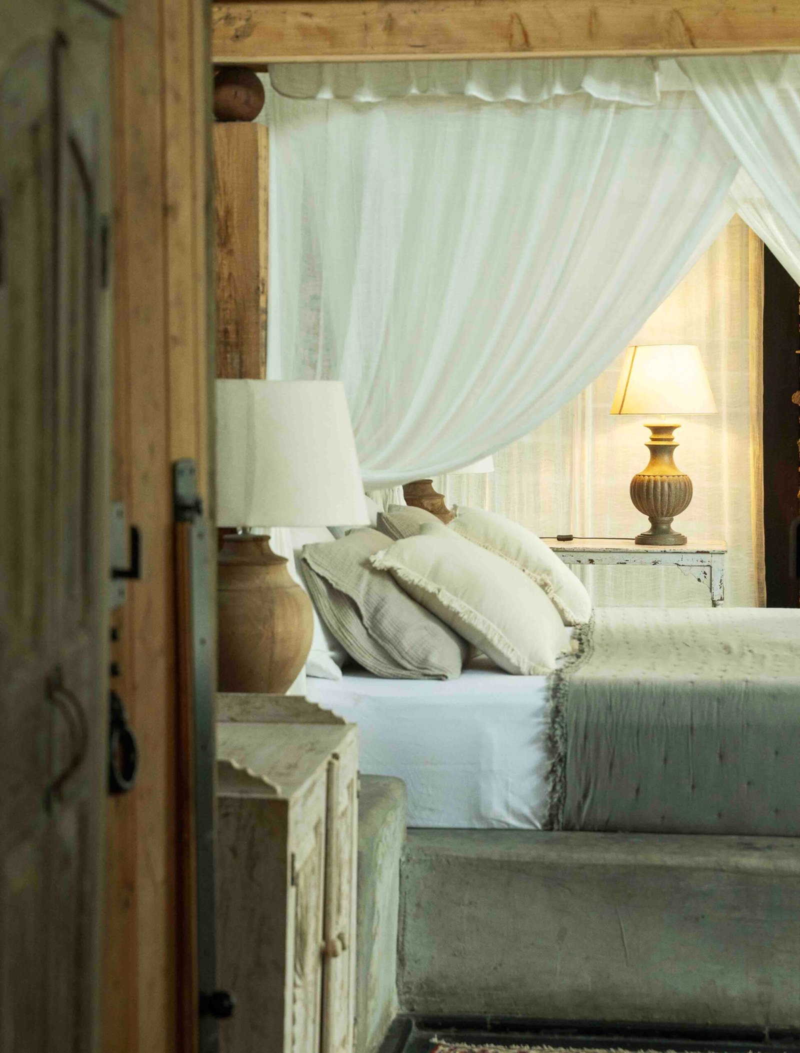 The E-Suite opens wide to its landscape, a 690 sq. ft. space orienting every moment toward the hills. Take in the view from the wooden four-poster bed, or from the floor-to-ceiling glass window seat that traces the panorama, offering a 180-degree sweep of forested slopes. Collected rugs, wooden chests, and carved pieces lend a grounded sense of place, set against stone walls and a cast-iron stove for wood-fired warmth. The en-suite bathroom mirrors this closeness to nature with full-height glass that frames bathing in forest light, paired with a wooden counter vanity.